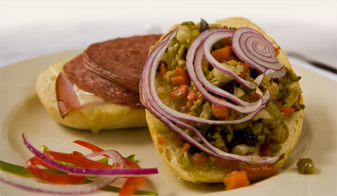Ham, salami, Swiss, purple onions, olive relish on a toasted hoagie roll.